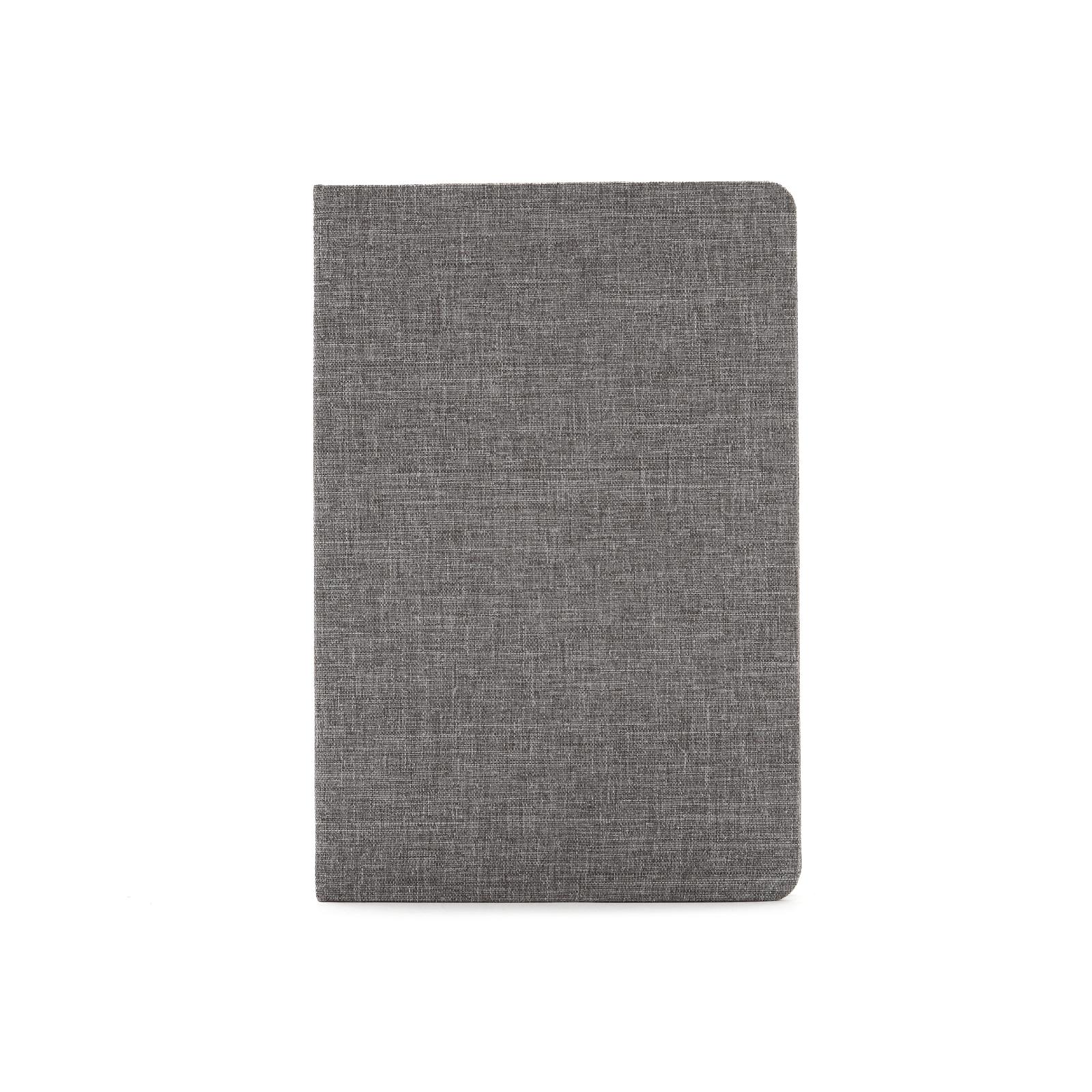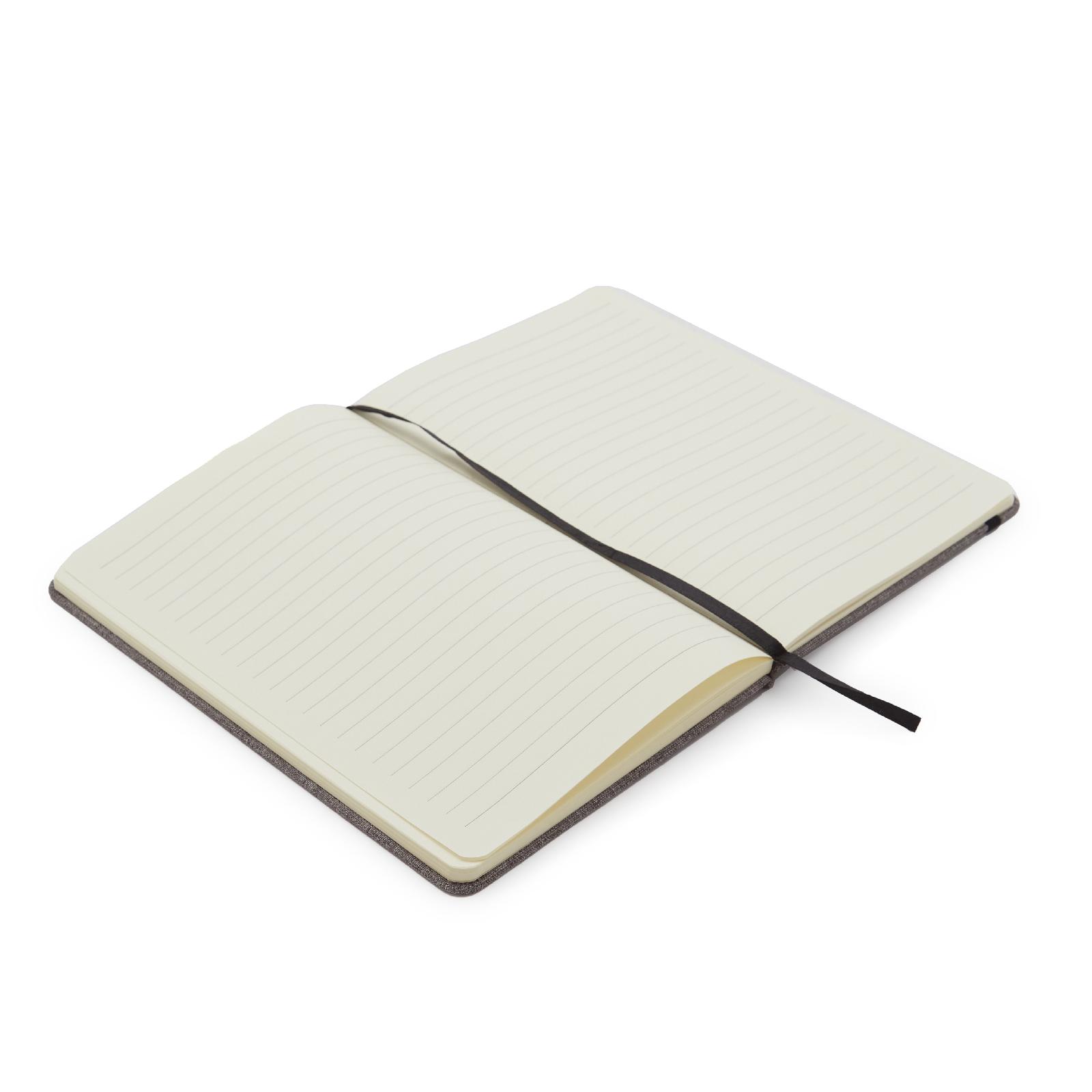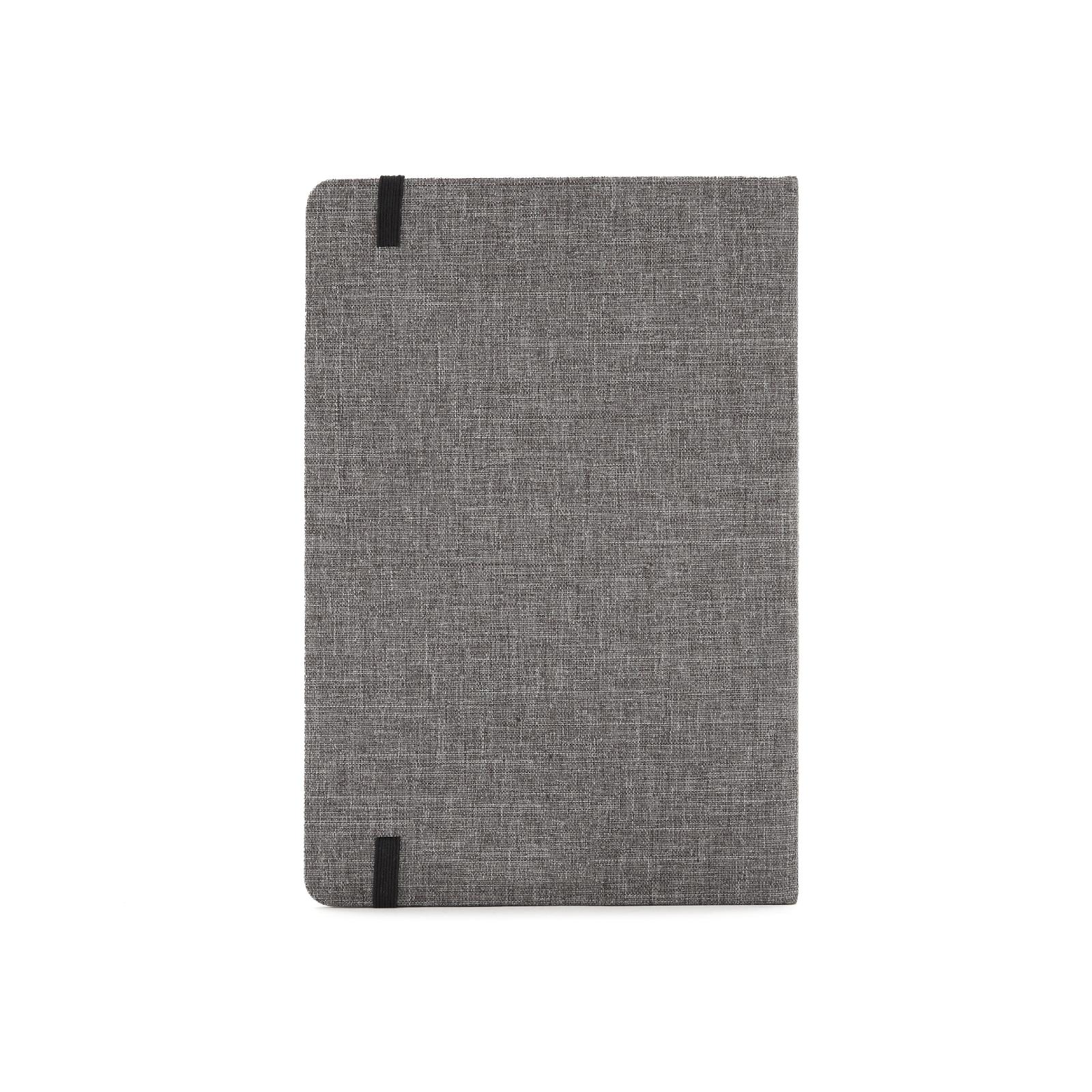 Cuaderno con tapa de tela 300D en dos tonos. Hojas internas de 70 gramos, con 80 hojas en formato rayado.